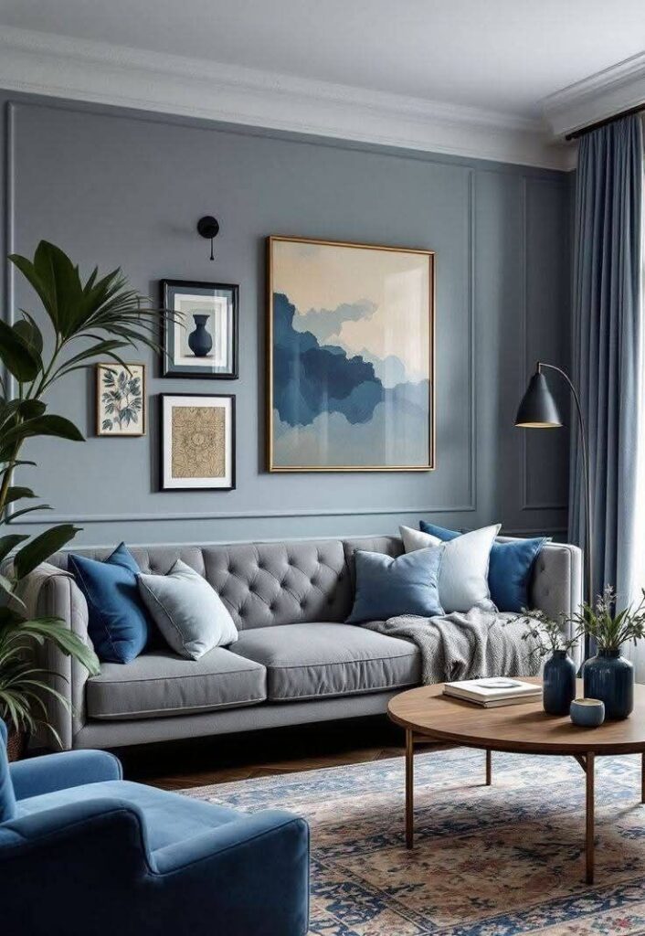 Tu jasno-niebieski to taki „oddech”, a granat może być akcentem np. na ścianie albo w dodatkach (poduszki, lampy).